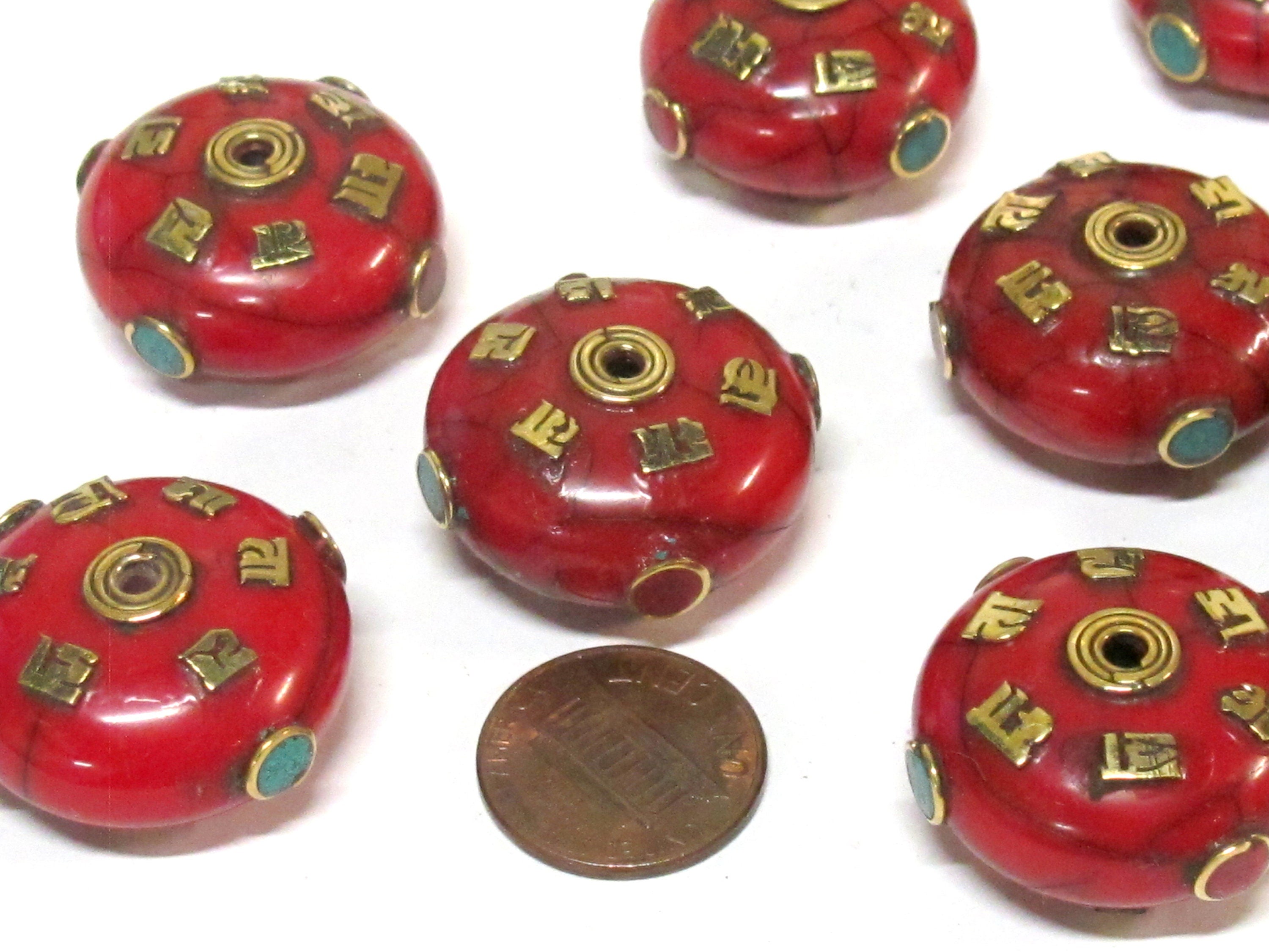 1 BEAD - Large 26 mm red color crackle resin Tibetan Om mani bead with brass , turquoise and inlay - BD719K 1 BEAD - Large 26 mm red color crackle resin Tibetan Om mani bead with brass , turquoise and inlay - BD719K