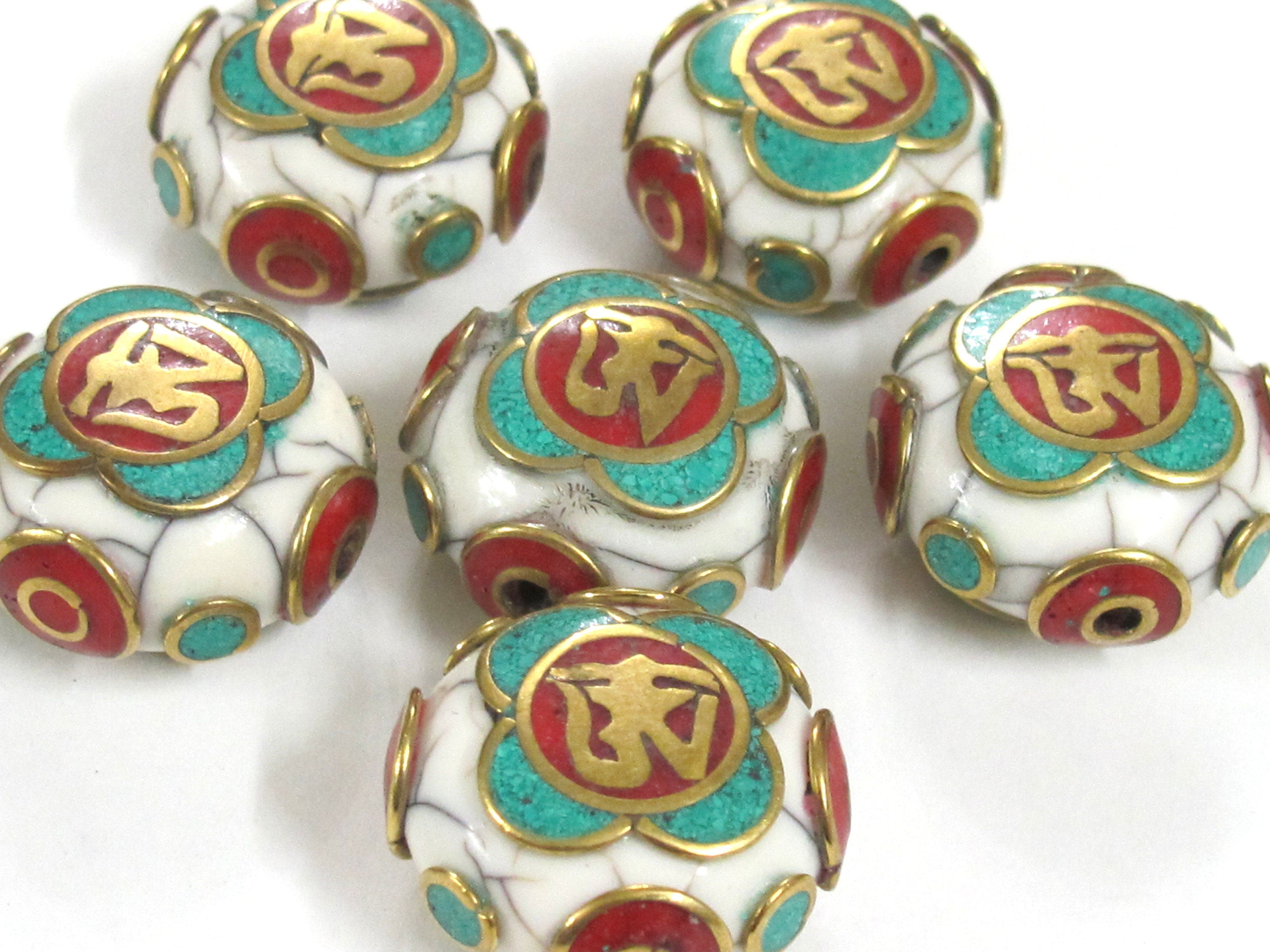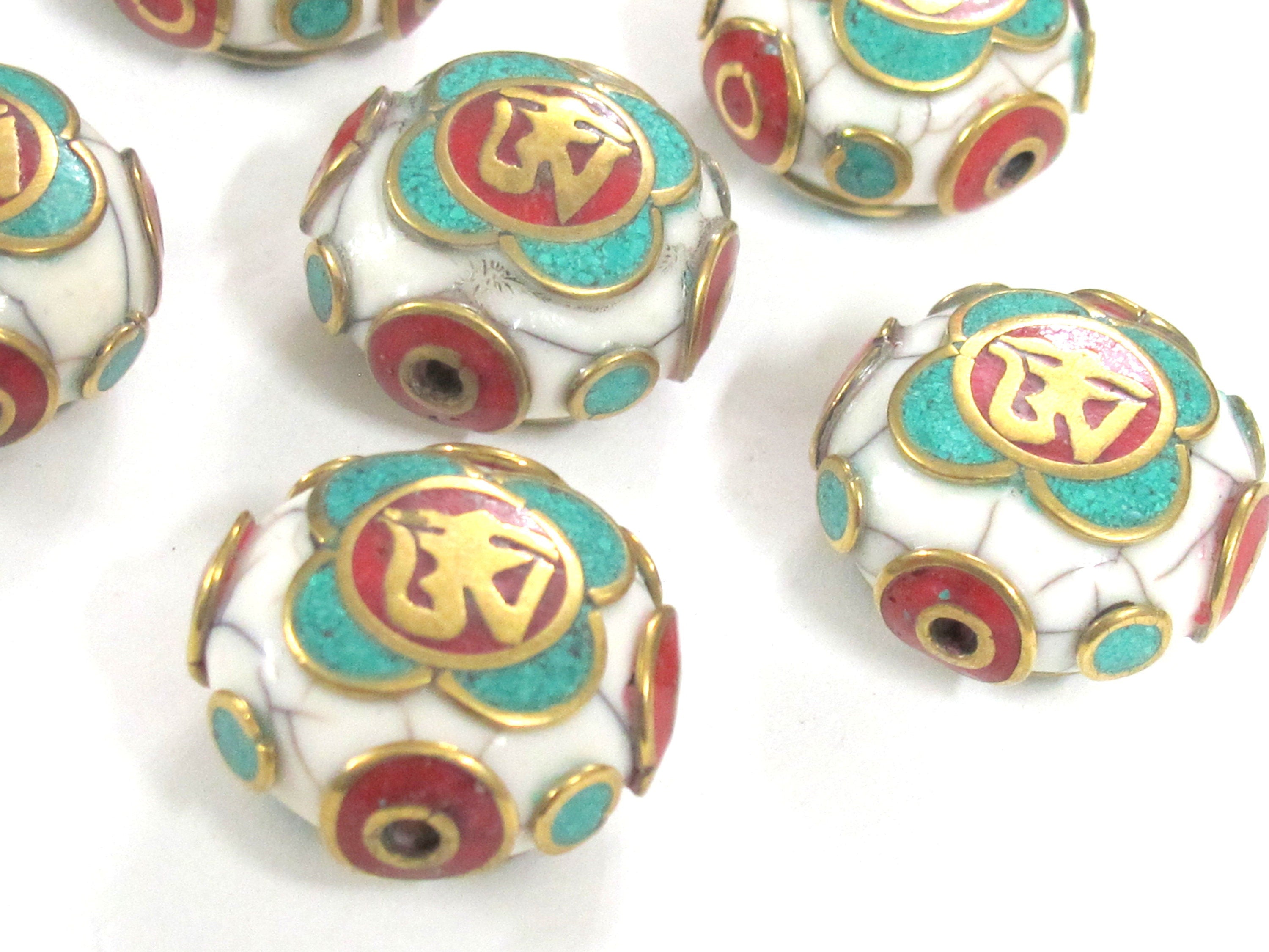 1 bead- White Crackle Resin Om Mani Bead Large 26 -27 mm Tibetan Prayer Bead with Brass & Turquoise Inlay for Buddhist Use – BD718A 1 bead- White Crackle Resin Om Mani Bead Large 26 -27 mm Tibetan Prayer Bead with Brass & Turquoise Inlay for Buddhist Use – BD718A