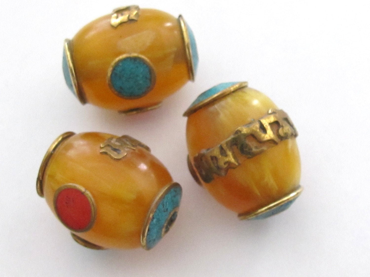 1 Bead - Tibetan copal resin Om mantra bead with brass , turquoise and coral inlay - BD375 1 Bead - Tibetan copal resin Om mantra bead with brass , turquoise and coral inlay - BD375