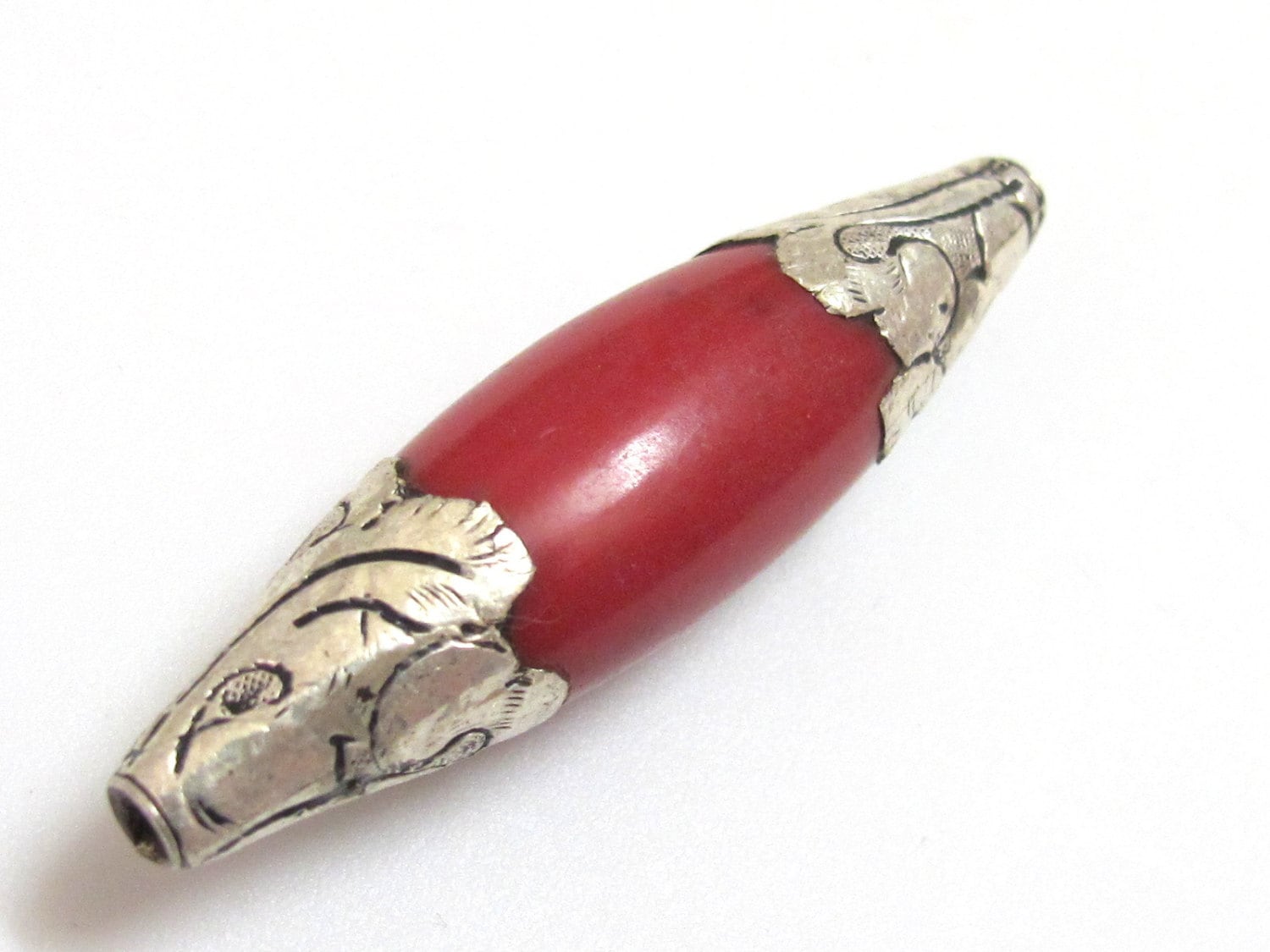 $8.49 USD1 Bead - Long Tibetan coral pendant bead capped with silver - BD295