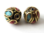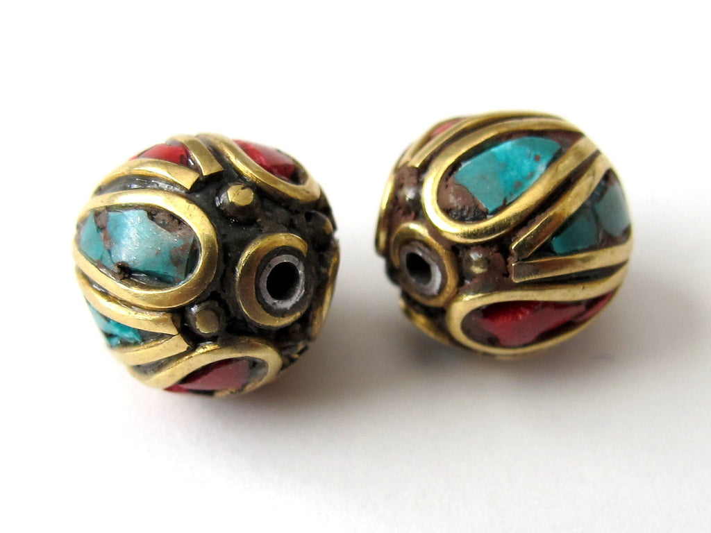 2 Beads - Nepal beads made of brass with turquoise and coral inlay -BD046