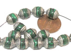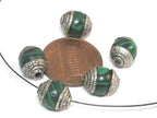Tibetan silver color capped synthetic green malachite gemstone beads from Nepal.